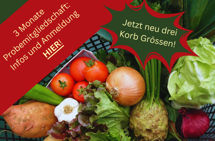 | wöchentlich Gemüse ca. für 3-4 Personen während 3 Monaten (mind. 12 Körbe): Ganzer Ernteanteil Probemitgliedschaft | 366 CHF | 2 halbe Tage |