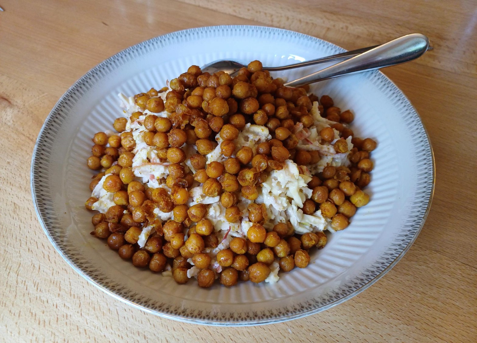Für das Topping die Kichererbsen abtropfen*, mit etwas Rapsöl und den Gewürzen mischen. (Nach Belieben auch weitere Gewürze, z. B. Zimt oder Chili verwenden.) Auf einem mit Backpapier ausgelegten Blech ausbreiten. Im Ofen bei 220° ca. 20 Minuten backen, bis die Kichererbsen knusprig sind.